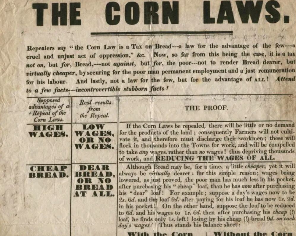 1815年,作为工业革命先驱的英国,通过《谷物法》(Corn Laws)开启关税战——当国内小麦价格低于每夸脱80先令时,政府便征收高额关税,甚至禁止进口。法国、普鲁士等欧洲其他国家也纷纷效仿,限制粮食进口,形成了欧洲范围内的贸易保护主义网络。