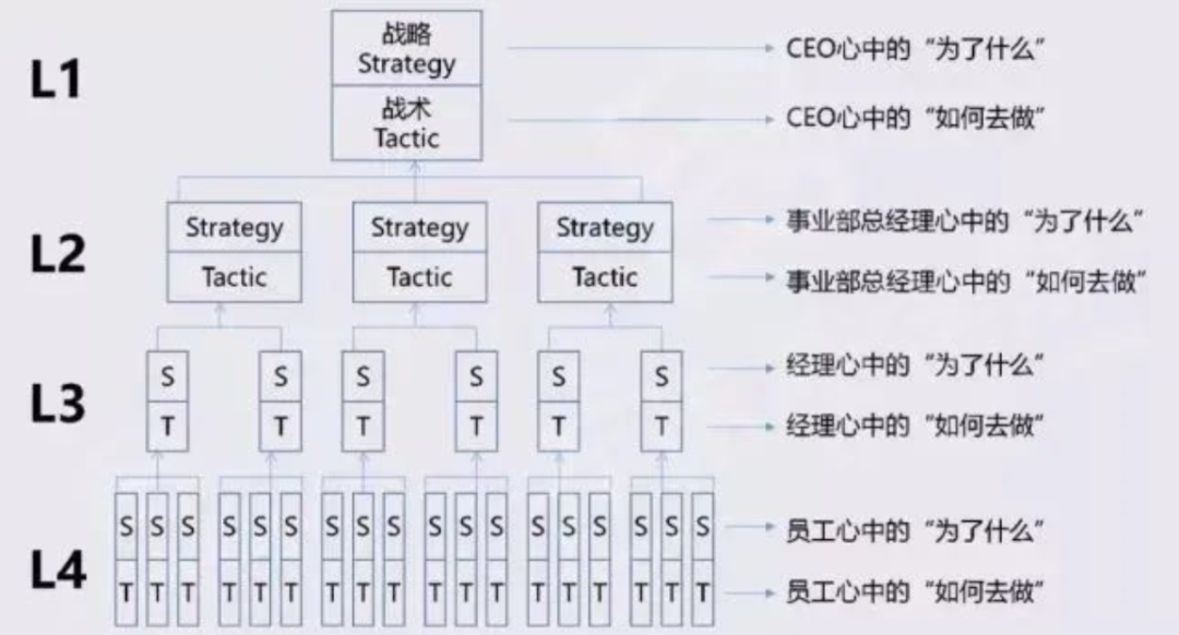 战略解码的输出就是关键任务和依赖关系,只有任务才可以被科学管理起来。解码的最后要形成这么一份战略战术ST图,要把上层的战术与下级的战略进行有效的联结,要确保下级的关键任务能够有效支撑我们的上级战略。让每个人能够各司其职,又能整体有效联结。
